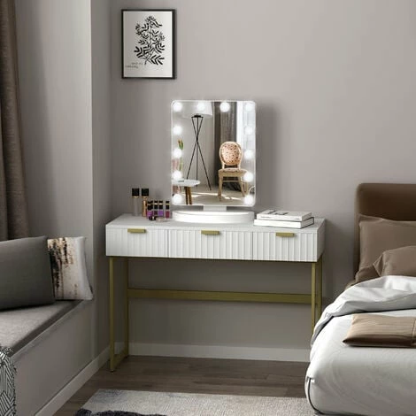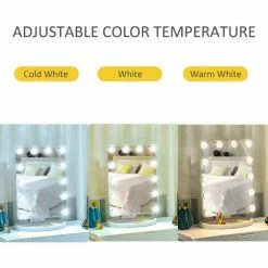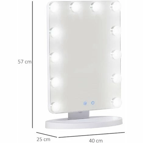 Be the star of your everyday life with this glamorous Hollywood mirror from HOMCOM. This classic design is a must for every bedroom and dressing space – with its large and clear mirror, surrounded by 12 LED bulbs for the perfect amount of illumination to get ready easily with plenty of light. Each bulb is dimmable and can be set to three different shades – warm white, white and cold white – perfect for day and night use. Bottom base with a groove for storing some cosmetics. A valuable addition to any dressing table top.