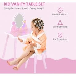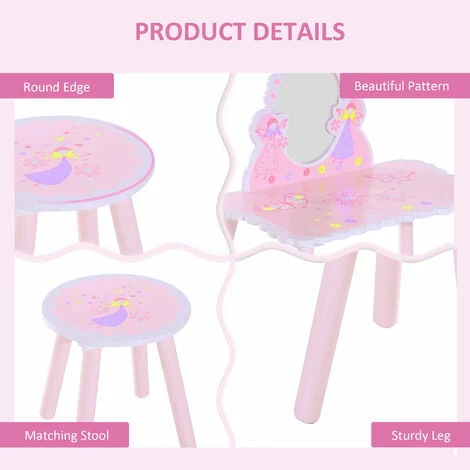 This HOMCOM dressing table is a great item for kids, comes with a stool and a mirror. This will be a great to have your child express imagination, and also can be used as a kids desk. Made from Pine wood and MDF it has great strength and stability and would be a perfect solution to any childs room. Finished in a pink print with a great welcoming design and would suit any room décor.