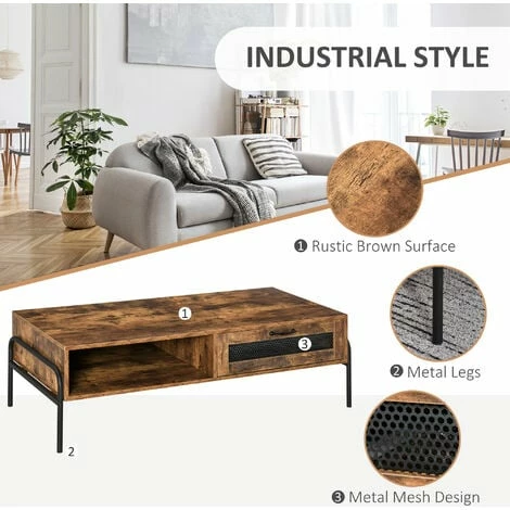 This stunning coffee table is a perfect addition for your home furniture in your living room, bedroom, office. Industrial design makes it look beautiful in any kinds of style. Comes with a drawer and a storage compartment for meeting your storage needs. Made of E1 grade particle board and metal frame, it’s built for long-lasting performance. Perfect for home decoration and everyday use.