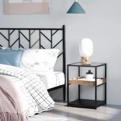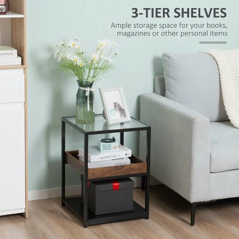 A unique take on home display and storage lies with this table/nightstand from HOMCOM. Three different layers: top glass shelf, middle wood-effect tray and bottom metal shelf for a combination of style and helpful holding space. The middle tray has small sides to try prevent items falling out. The glass top offers a sleek look and a solid holding place for all items. The frame, made from steel, is sturdy, supporting up to 15kg in total.