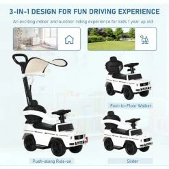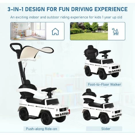 Your search for a fun sliding car stops here. Give children aged between 12-36 months this impressive piece from HOMCOM. Officially licensed Mercedes design adds to the extra fun. Features a moving steering wheel and horn. The seat with backrest is comfortable supportive, with the outer guardrail ensuring safety. Comes complete with a top canopy so they don’t get burnt by the sun whilst cruising outdoors. Three-in-one design: a walker, slider and push ride-on.