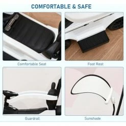 • Comfortable seat with foot rest, guardrail and protective sun shade. Seat is low so they can get on and off safely