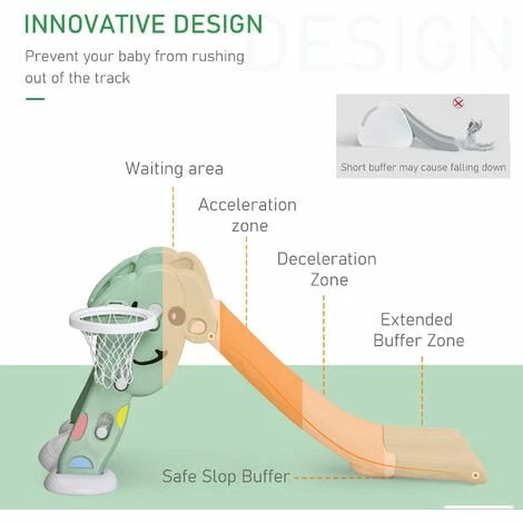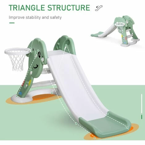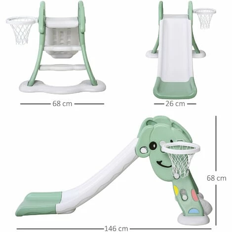 ● Two-in-one function, composed of slide and basketball hoop