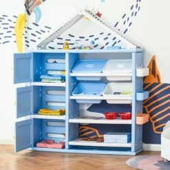 paired with the three outer baskets, there’s more than enough for keeping their area clean and tidy. It’s made from plastic, so it’s tough and can be wiped clean easily. Finished with handles on the cupboard doors.