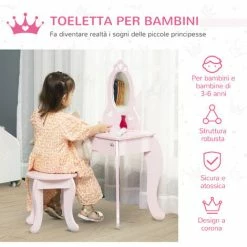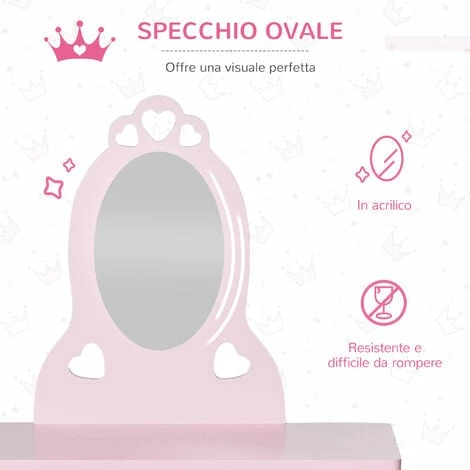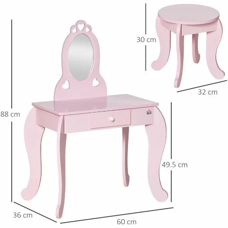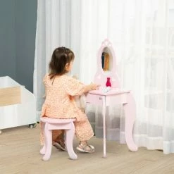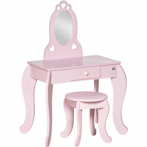 Princess perfect in one set. This dressing table and stool, from HOMCOM, is a noble way for them to get ready day and evening. Pink in colour, it features heart cut-outs on the top and side of the mirror for extra magic. The curved legs of the table and stool create a modern and relaxed look. There’s a small drawer for keeping accessories safely stored. The mirror allows your child to get ready – whether just pretend getting ready, or going out to see friends.