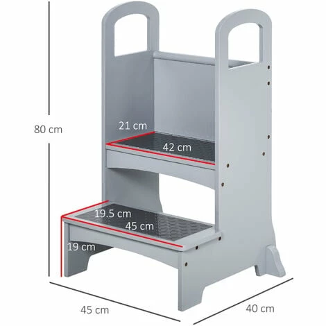 • Dimensions: 80H x 45L x 40Wcm. Lower step: 45L x 19.5Wcm. Higher step: 42L x 21Wcm. Top step to top: 26cm. Bottom step to ground: 19cm. Space between steps: 19cm