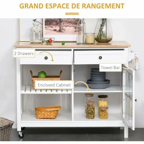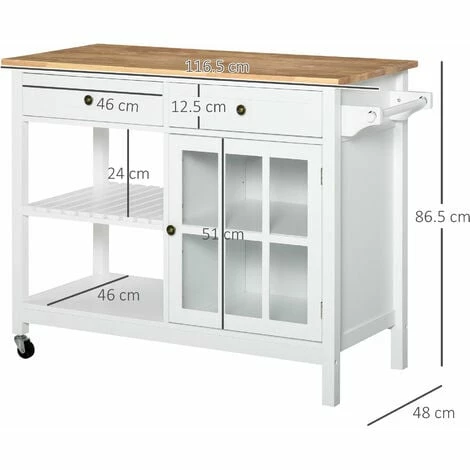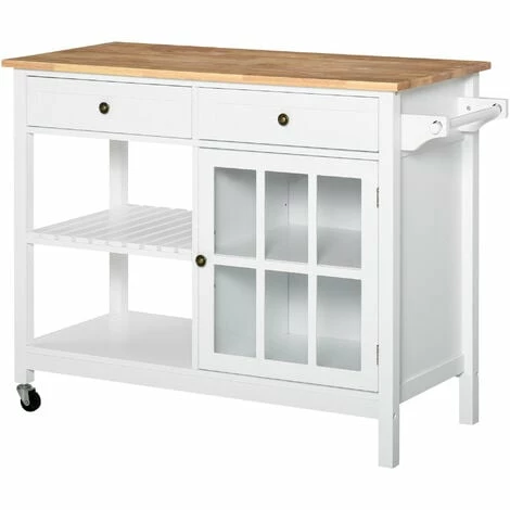 Looking to maximize your kitchen space? This storage trolley on wheels features a simple modern design and can be fit into various styles of decorations. Comes with 2 easy-glide drawers, a concealed cabinet, 2 open shelves, and a towel bar. This drinks trolley has a compact design and great storage capabilities. Upgrade your kitchen today with our HOMCOM kitchen island table.
