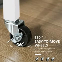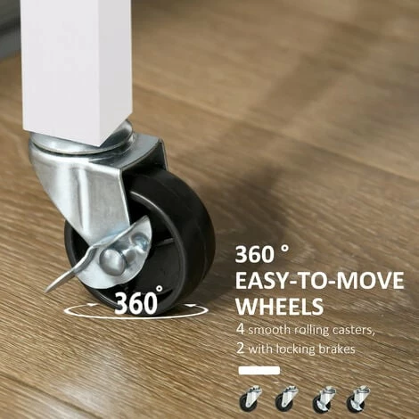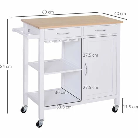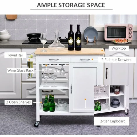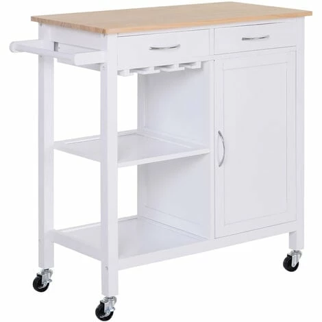 This versatile rolling kitchen trolley serving cart from HOMCOM is a perfect addition to your home. Features white MDF body with pine wood worktop, it’s designed for durable long term use. With 1 worktop, 2 drawers, 1 Two-tier cupboard, 2 storage shelves, 1 towel rail and red wine glass rack, this wood kitchen trolley offers ample storage space. It can be used as an island within your kitchen or for added storage in the bathroom, dining room, garage, laundry room, nursery, or the bedroom.