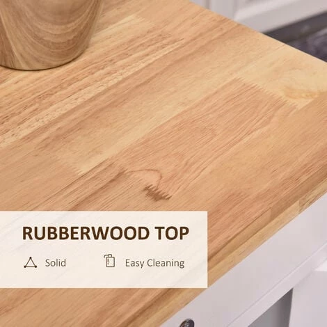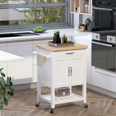 This versatile rolling serving trolley from HOMCOM is a perfect addition to your home. Features white MDF body with rubber wood worktop, it’s designed for durable long term use. With 1 worktop, 1 drawer, 1 cupboard, 1 storage shelf and 1 towel rail, this wood kitchen island offers ample storage space for various utensils.It can be used as a storage center for dining room, garage, or the bedroom. Add a modern touch to your living space with this classic rolling veg trolley!
