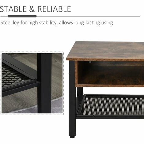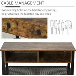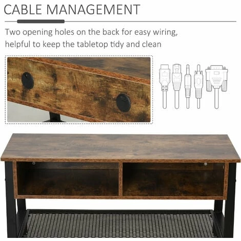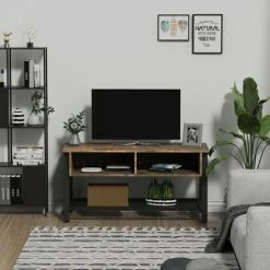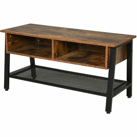 Rediscover the beauty of industrial styling with help from this TV unit from HOMCOM. In a sleek chestnut brown and matte black finish, it is crafted into a spacious design. A large steel mesh shelf is placed on the bottom and two smaller compartments on the top, giving you plenty of storage and display room. Using steel for the base frame and legs, this piece is tough and continually balanced. It’s finished with a large tabletop for extra holding room and adjustable feet to keep the balance.
