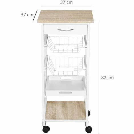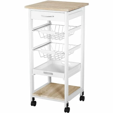 This compact cart is ideal for small home spaces which require extra storage. It features a top drawer for utensils, two metal wire baskets, a slide-out tray and bottom shelf, giving you lots of handy space for the kitchen and beyond. Each tray can be taken out and used separately if wanted. It comes with four wheels on the bottom so you can move it around easily. A beautiful white and natural wood-effect design which will look good standing almost anywhere.
