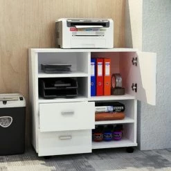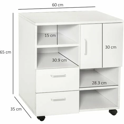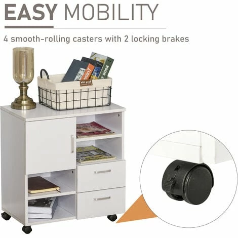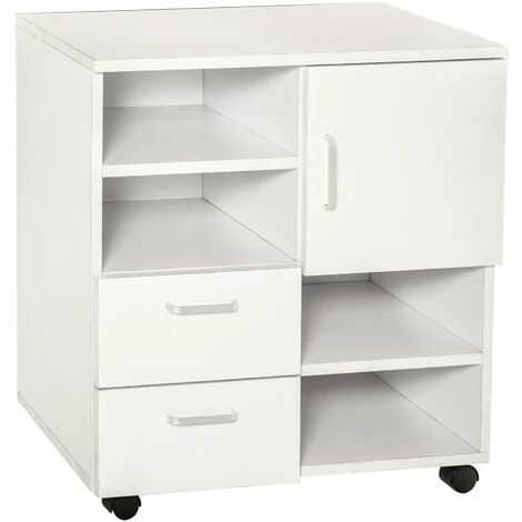 This mobile multi-purpose cabinet from HOMCOM is designed to provide an ideal storage solution for your household accessories or office essentials with generous storage space (4 drawers, 4 shelves and a cupboard with a door). It comes with 4 omni-directional wheels with brakes to keep your unit stable yet mobile. Made from particle board with white veneer laminate finish for easy maintenance and cleaning. This stylish and practical unit is ideal for any living room bedroom, hallway or in the office.
