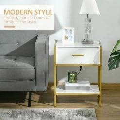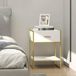 Simple, sophisticated style comes in the form of this bedside table, from HOMCOM. It blends together a gold tone frame with a white body – a furniture piece which matches easily with lots of different decor. The design comes with a top drawer, bottom shelf and flat top – plenty of storage room. The frame is made from steel for strength, with a matching slimline handle to open and close the drawer easily.