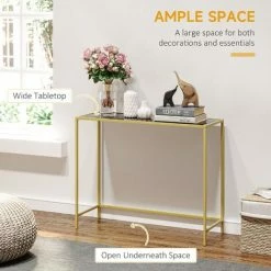 Blending style and storage function together, this sofa console table from HOMCOM is a distinctive piece of furniture you’ll love having at home. Our console tables for hallway feature a spacious desktop to display photos, ornaments, keys or earrings and the open space underneath for you to place several container box or shoes. Tempered glass tabletop and solid steel frame ensure your stable daily use. Embrace modern chic in your living room, bedroom, and entryway.