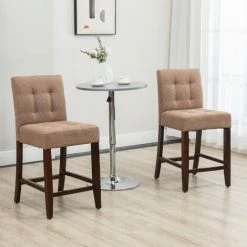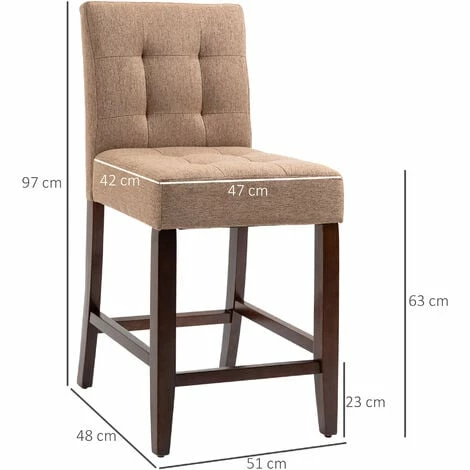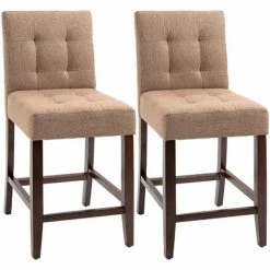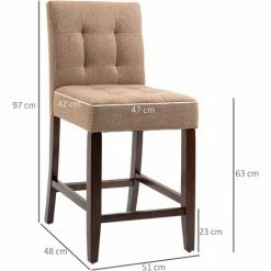 Dress bar and dining areas with a slice of modern style: these two bar chairs from HOMCOM will do the job. Covered with linen-look upholstery, with button tufting for an on-trend look. The wooden structure makes breakfast bar stools strong and supportive, with bottom bars to rest your legs. Padding and tall back for comfort and support. Completed with handy adjustable feet.