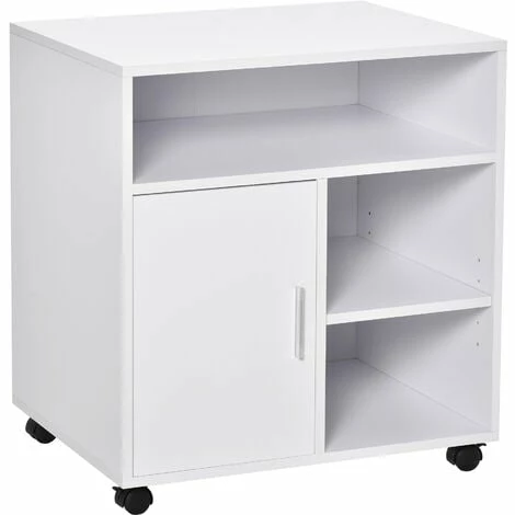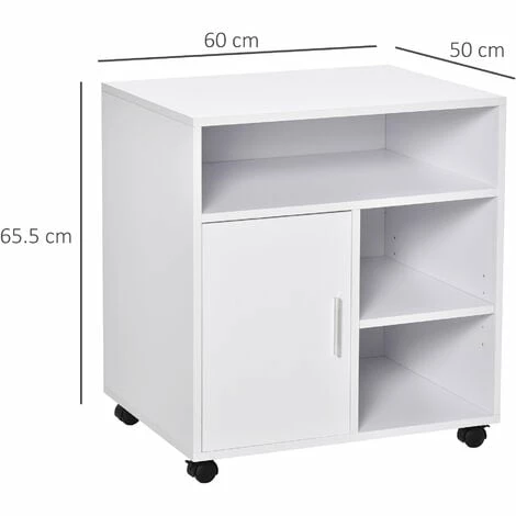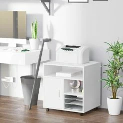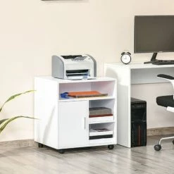 Optimise your office printing area with this cabinet stand from HOMCOM. It is made with a large tabletop to place your printer, an open compartment for easy access to essentials, two open shelves and a bottom cupboard with two shelves – keeping everything you need hidden away and organised. The inner shelf is adjustable if you need different heights. Four wheels for easy movement, with two being lockable to keep the unit stationery. A must for keeping the shared essentials in an obvious place.