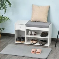 Keep the style simple and the storage spacious with this white shoe bench from HOMCOM. This multifunctional design features three open compartments for shoes and boots, a small top drawer for keeping small bits together and a cushion top section for sitting comfortably. Made from a blend of MDF and particle board for enhanced strength which can handle up to 150kg, it is finished with a small white handle on the drawer for easy opening and closing.
