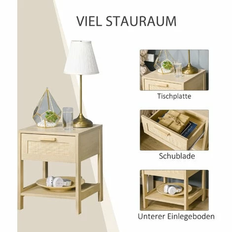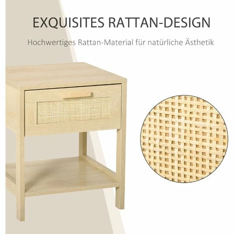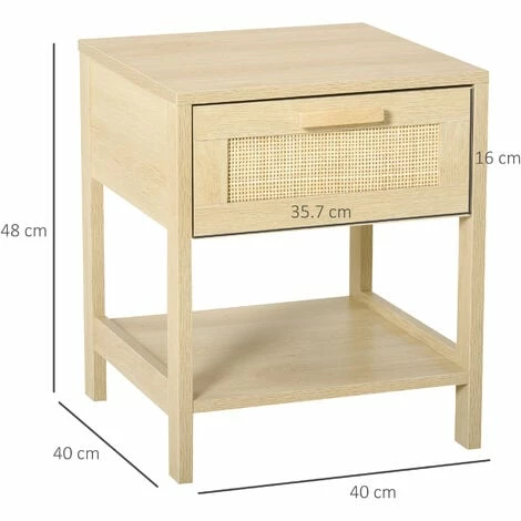 Bring the natural beauty of outside into your inside styling with this bedside table from HOMCOM. Here we see a woven rattan panel on the drawer, playing contrast to the smooth wood-effect of the structure. It also amps up the striking look of the whole piece, which looks great by itself or mixed with other furniture. It features a large drawer, open bottom shelf and flat table top, so there’s plenty of storage room. Finished with four small feet to elevate and a long handle to open and close the drawer easily.