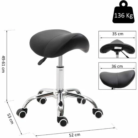 Ensure you have the correct posture when work in your saloon/tattoo parlour, or even at home, with this hairdressing chair from HOMCOM. Using heavy-duty steel for a balanced and weighted base, With a height-adjustable design, this adjustable stool ranging from 49cm to 61cm to suit your needs. Curved in shape, the padded seat allows you to sit comfortably whilst keeping you supported and inclined to sit upright and in the correct posture. Five wheels for you to move around easily when seated.