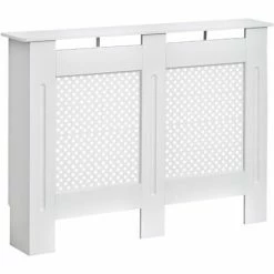 This HOMCOM radiator cover cabinet is a must for any home, cover your unsightly radiators and give your room a touch of elegance. Made with MDF board with a round shape grill, it is finished in white as a neutral colour to match any décor. The white painted cabinet has a front grill design to look great and still radiate the heat efficiently and still have enough access to any controls attached. It’s easy to assemble and will look great in any décor.