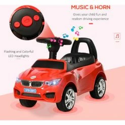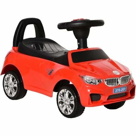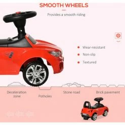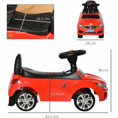 Ride in style with this fancy foot to floor ride-on from HOMCOM. Its red body and snazzy rims resemble a real car. Ideal for ages 18-36 months, the PP seats and high backrest allow young riders to use comfortably. With added music and flashing headlights, the entertainment is endless. They even have a secret base beneath the seat to keep toys and snacks. By having a big steering wheel and an anti-overturning system, your child can enjoy the ride safely.
