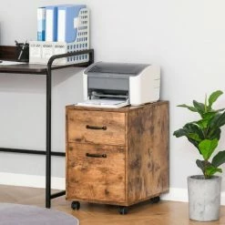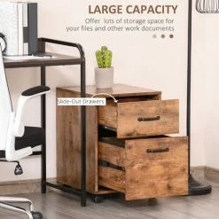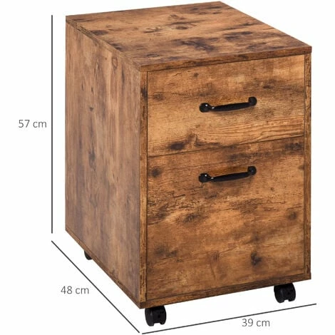 Blending storage space and a compact size into a sleek wood-effect design, this filing cabinet from HOMCOM is made to make you fall in love with your office space once again. It features one small top drawer and one large bottom drawer to give you all the room needed for files and stationery. There is a rail in the bottom drawer for hanging your letter files for organisation. Four wheels are fitted on the bottom for easy movement – two of which can be locked to keep the unit in place when needed. Made from MDF, this is a solid and durable piece which will support you every day.
