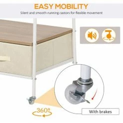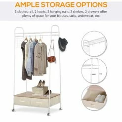 If you want to keep your daily items well-organised, this has 2 shelves, a top rod and 2 drawers to place your clothes, bags, decors and other accessories. Under the bottom tier, you can easily fit items such as slippers. With 4 wheels, it can easily move from one place to another, and can be locked in place. Also includes 2 chromed racks and 2 S-shape hooks to hang your jackets, shirts, umbrellas, hats and more.