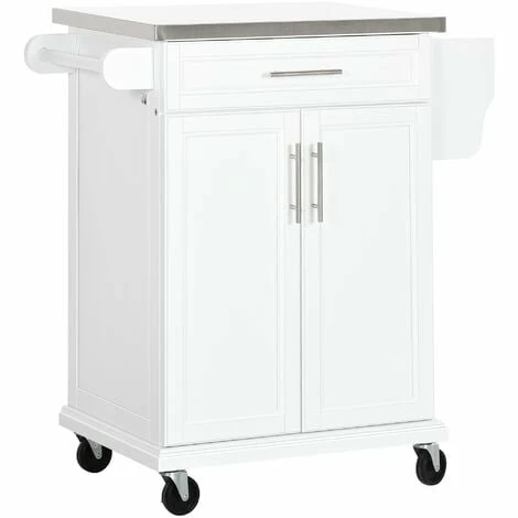 This stylish kitchen base unit from HOMCOM is a great addition to any kitchen space, providing additional storage and a preparation area. This bar cart comes with a drawer, storage cupboard, towel rail, spice rack and knife rack for plenty of storage. The metal countertop gives safe preparation area. Completed with four wheels to move around easily.
