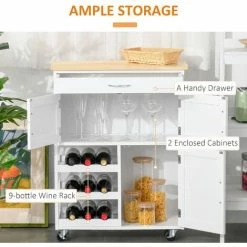 This storage trolley on wheels is an ideal option for any kitchen and dining space – no matter the size. Comes with a drawer, three three-bottle wine shelves and three cabinets provide plenty of room for holding everything together. Wheels allow you to move it where you desire. The rubberwood countertop is hard and ideal for prepping drinks garnishes when friends come over. Simple, white clean design – a modern home addition.