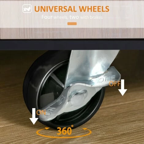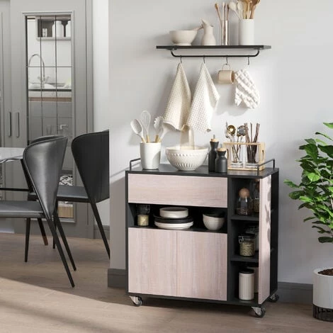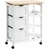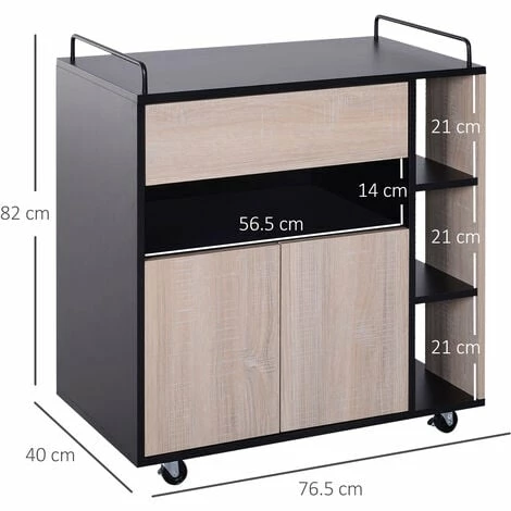 This versatile rolling kitchen trolley and serving cart from HOMCOM is perfect for your home. With 1 worktop, 1 drawer, 1 compartment, 1 cupboard and 3 storage shelves, this wood kitchen trolley offers ample storage space for various utensils. It can be used as an island within your kitchen or for added storage in the bathroom, dining room, garage, laundry room, nursery, or the bedroom. Add a modern natural touch to your home with this classic 3-tier rolling kitchen trolley cart !