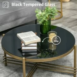 Be bold and daring with your home furnishings this season: bring this standout coffee table, from HOMCOM, into your home or office space. It combines a gold coloured frame with a black top, allowing both colours to contrast and complement each other beautifully. The frame, made from metal for strength, is crossed over for extra balance and support. Glass table top is flat for handy holding space. It wipes clean easily for hygiene.