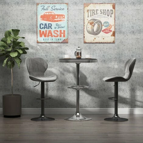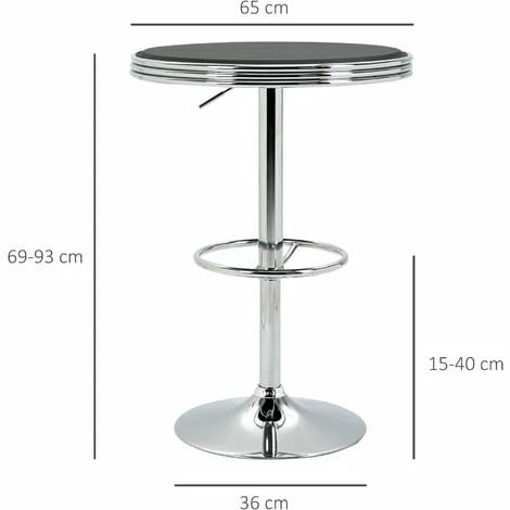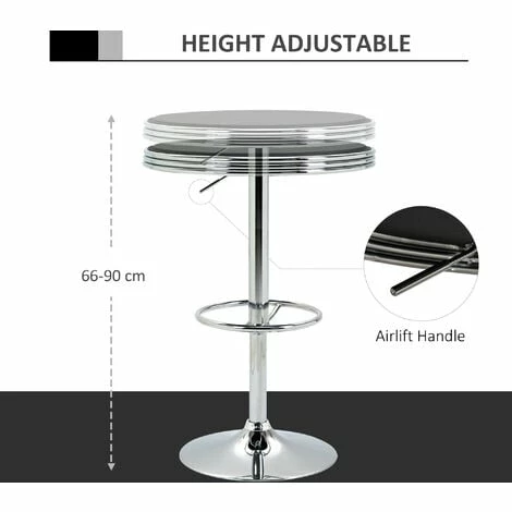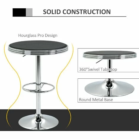 Style which stands the test of time: this HOMCOM poseur bar table pairs perfectly with stand-up drinking or high chairs. Steel frame with a large round base on the bottom and includes anti-slip pad to keep it balanced. The top of this kitchen table is formed of the ribbed edges and faux leather, creating a mix of executive style and cool texture.As well being able to conveniently adjust the height, it also features an adjustable footrest to set to a level most comfortable for resting the feet.