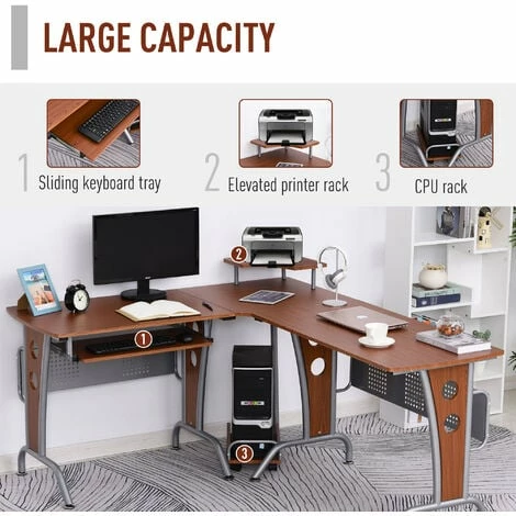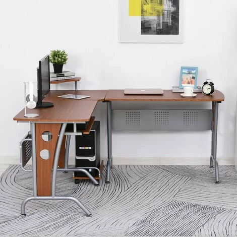 This large corner desk, from HOMCOM, is a superb addition to any office or gaming room. Its L-shaped design bring maximum space whilst fitting into corners with ease – perfect for rooms with little space to spare. Using steel for the frame, the structure is reliable and sturdy, fitted with oak tone MDF shelves which are solid and equally as sturdy. It’s coated with melamine, meaning it is smooth the touch and easy to wipe clean, and is finished with adjustable feet to keep balance, a slide out keyboard tray, metal boards on the back for protection and a removable CPU tower to hold your computer unit. A fantastic addition for the home and office.