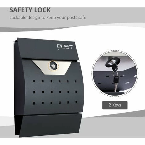 The modern and stylish mail box from HOMCOM features a front loading slot covered by a flip-up lid. It is lockable to help keep your posts safe with 2 keys included. And the slot at the bottom is designed to receive an hold newspapers. Fixing screws included, it is easy and quick to install on any wall. Constructed from durable steel, it will provide long-lasting reliable usage.