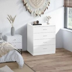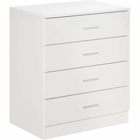 Simplicity is sophistication with this HOMCOM chest of drawers bedroom. A clean white colour, paired with the classic boxy shape and touch of silver-tone – thanks to the aluminium handles – means the tallboy chest of drawers is welcome anywhere you want it to be. Formed of four drawers: plenty of space to keep home tidy, such as clothes, books and more. Metal gliding rail inside each drawer for smooth opening and closing. Finished with a slightly thick base for elevation and steadiness.