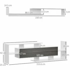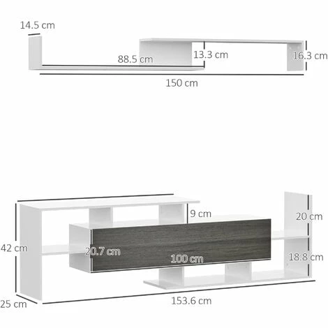 ● Overall Dimension: 153.6W x 25D x 42H cm (TV stand), 150W x 14.5D x 16.3H cm (wall shelf)