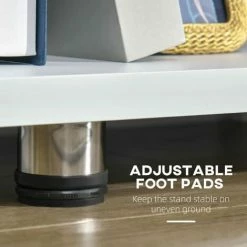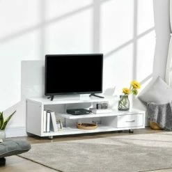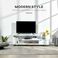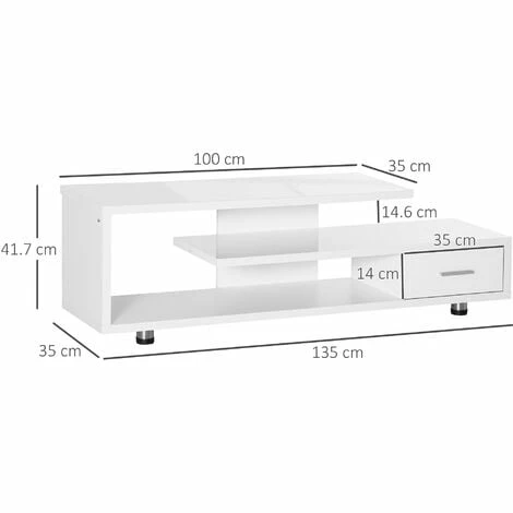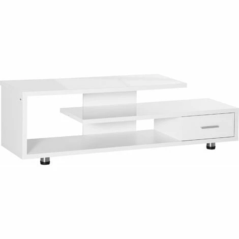 Upgrade your living room and entertainment area with this HOMCOM TV unit for 45 inch tv. A mixture of shelves and the drawer offer handy storage room. The entertainment unit is made from particle board for durability, shaped into a modern curved shape, with a high gloss finish for extra on-trend style points. Completed with adjustable feet.