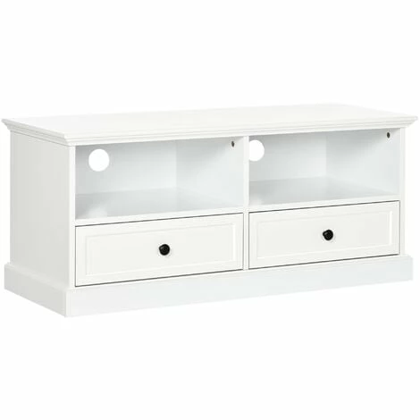 A classic home piece, in a classic design. This HOMCOM TV storage unit is an easy way to organise your viewing and relaxation space. The white colour makes it a fresh piece which is easy to blend with other furniture. Made from MDF for durability, it comes with two drawers and two shelves, so there’s plenty of storage room to keep your space tidy. Comes with two handles on the drawers to open and close easily.