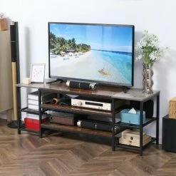 Upgrade your living room with this HOMCOM TV unit. It has six shelves and a large table-top: room for holding a TV and all the watching essentials you need. The open shelves of the TV stand are suitable for fitting plenty of differently-sized appliances. The black metal frame means a strong structure, whilst the wood-effect shelves create a striking look for industrial style. A must-have companion for every relaxing moment.