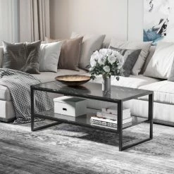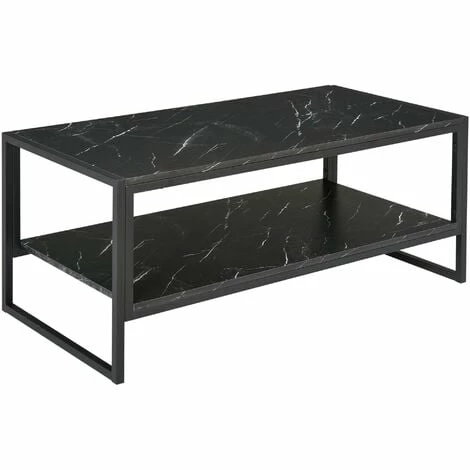 Bringing a sleek and exciting twist to an everyday home furnishing piece, this coffee table from HOMCOM is perfect for updating your space instantly. Its two-tier design ensures it will give you plenty of room for storing and holding what you need, with the metal frame ensuring it is strong and sturdy for everyday use. Both table tops are made into a black and laminate marble print table top finish for a beautiful look which looks great placed almost anywhere.
