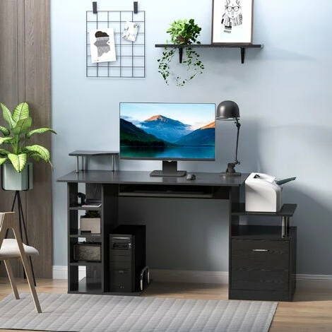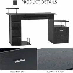 This computer desk is perfect for any home or office. It’s a great solution to have your computer on with the ability to use a workable space. With its separate area to hold your desktop, a neat shelf for your monitor or printer and a pull out shelf for your keyboard and mouse. Also has some storage area for your file or other nik- naks. Its elegant design and looks would be a great solution in any environment.
